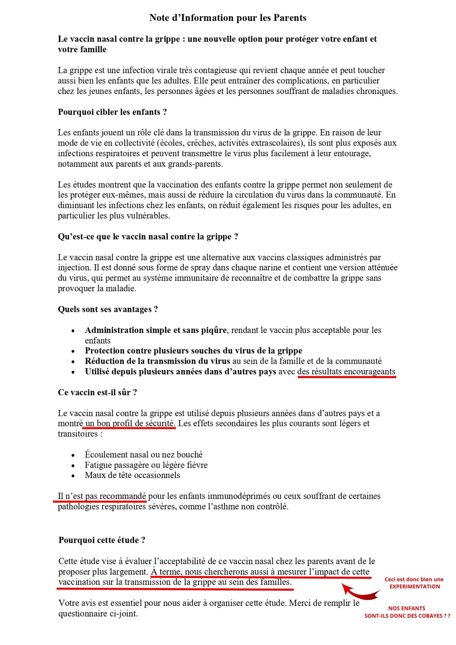 « Il est vrai que nous n’avons pas vu dans la plaquette distribuée aux familles, la mention parlant des effets indésirables. Ni d’ailleurs dans le document recueillant les consentements des parents. Il est pourtant nécessaire pour faire un choix éclairé et donner le consentement de vacciner ou non son enfant de recevoir une information claire, complète, compréhensible et appropriée à sa situation*. Les parents ne l’ont donc pas reçu. »